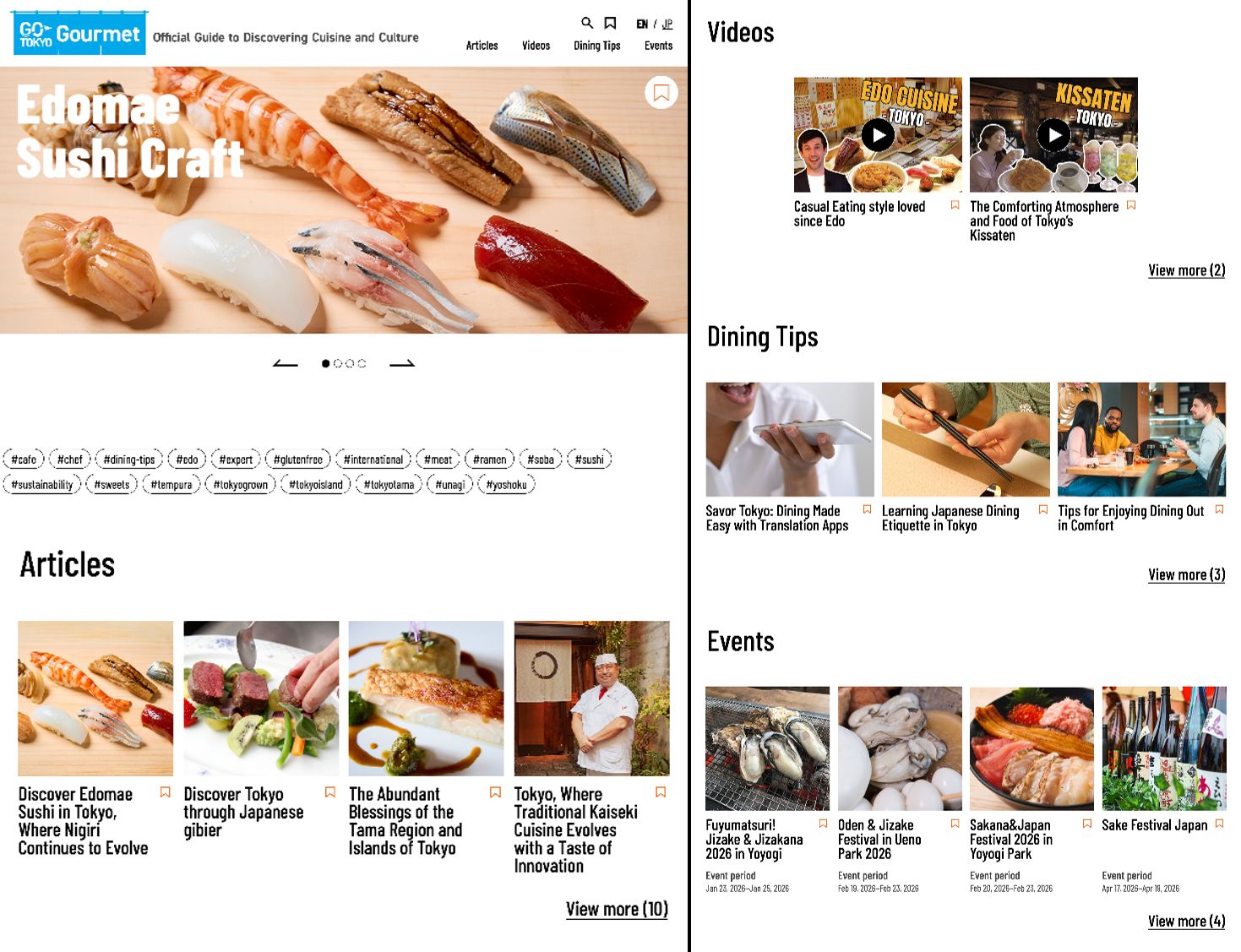 ช่วยให้การรับประทานอาหารอร่อยและสะดวกสบายยิ่งขึ้น เพื่อส่งเสริมประสบการณ์การรับประทานอาหารให้อร่อย สะดวกสบาย และน่าพึงพอใจยิ่งขึ้น เว็บไซต์นี้จึงให้ข้อมูลเกี่ยวกับวิธีการเพลิดเพลินกับอาหารญี่ปุ่น รวมถึงบริการและมารยาทที่เป็นเอกลักษณ์ของญี่ปุ่น นอกจากนี้ เว็บไซต์ยังให้ข้อมูลของกิจกรรมที่เกี่ยวข้องกับอาหารที่จัดขึ้นในโตเกียวอีกด้วย